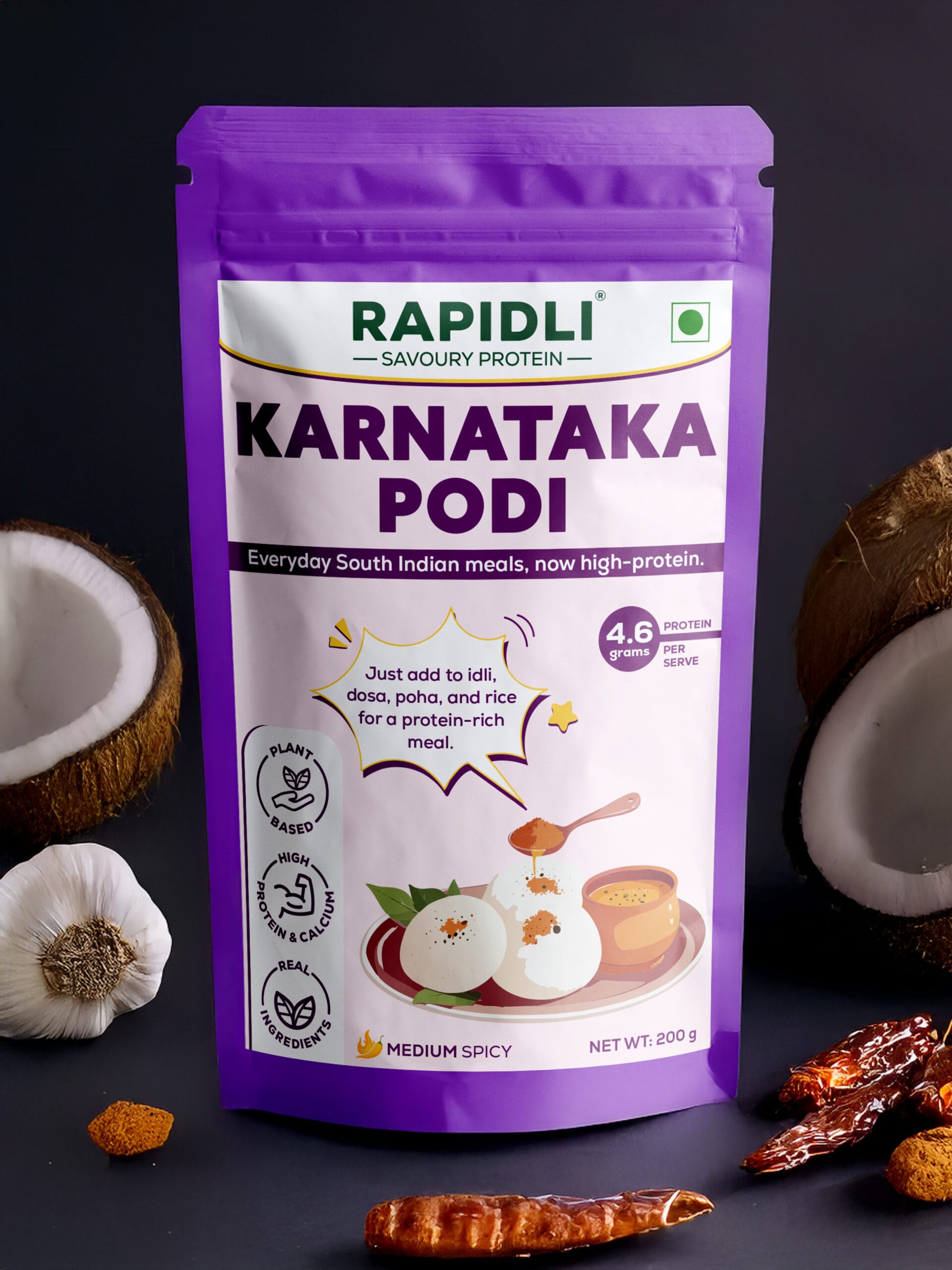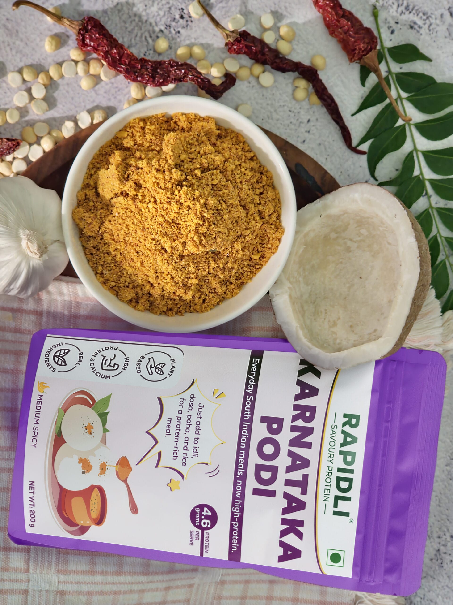 Roasted pulses meet native chillies, coriander, curry leaves—ground to perfect texture. No preservatives, no additives, no fillers, 4x protein density vs regular podi. Precision blending preserves nutrition and bold flavour.